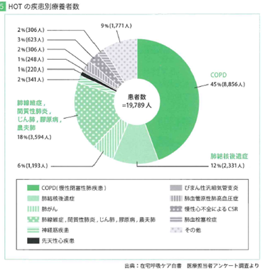 在宅酸素療法(Home Oxygen Therapy:HOT)は、自宅で酸素吸入を行うことによって低酸素血症を改善し息切れや呼吸苦などの症状を軽減させる治療であり、生命予後の改善やQOLを向上させることが可能です。